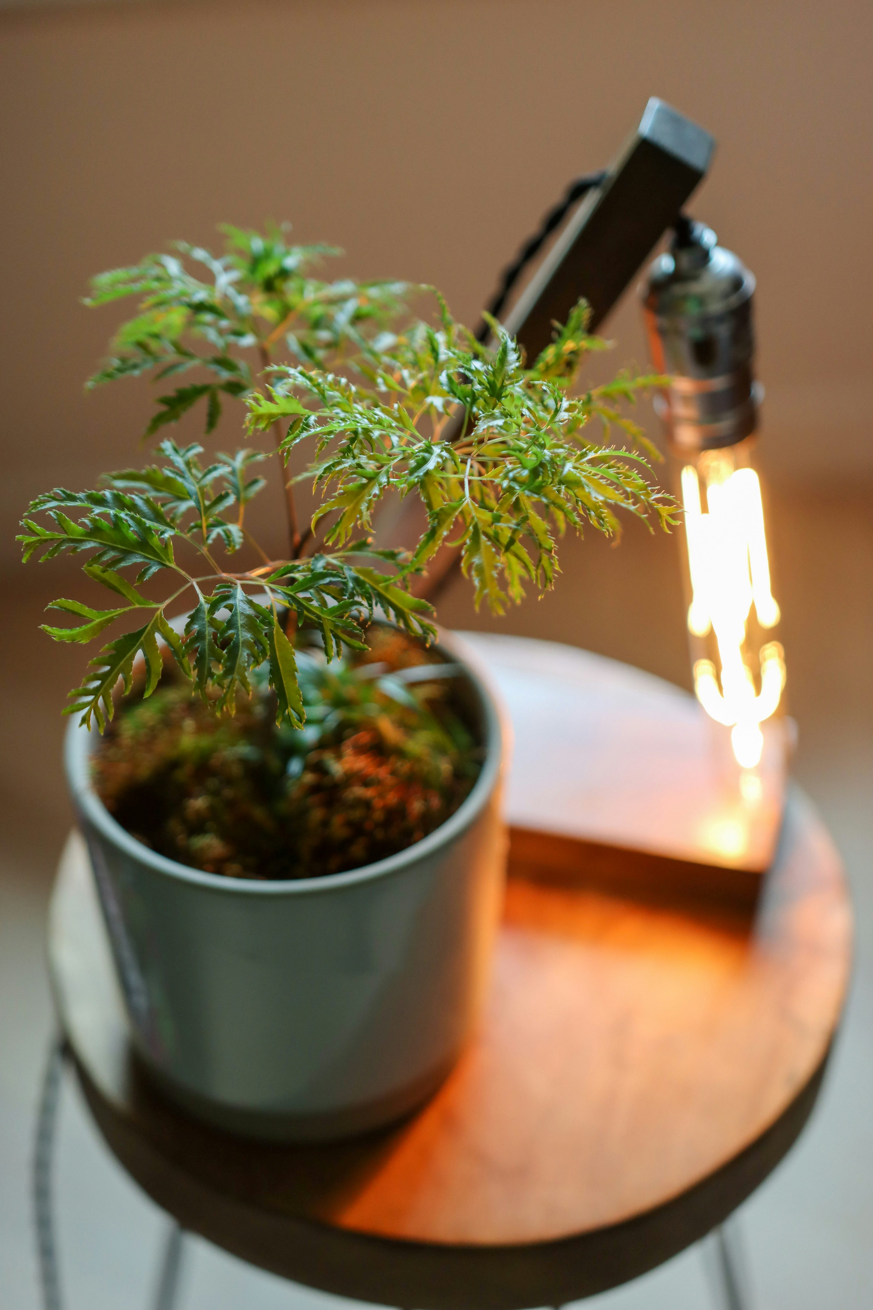 - 스투키 + 미니 조명 + 흰 세라믹 화분